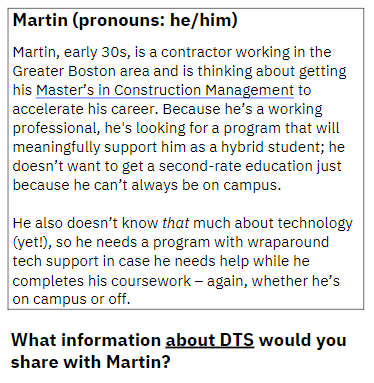 Upon consideration, I decided to design a more active skills-based learning experience. The objective was for learners to accurately and appropriately describe key functions of DTS to prospective students, just as they would need to do in the course of their job.